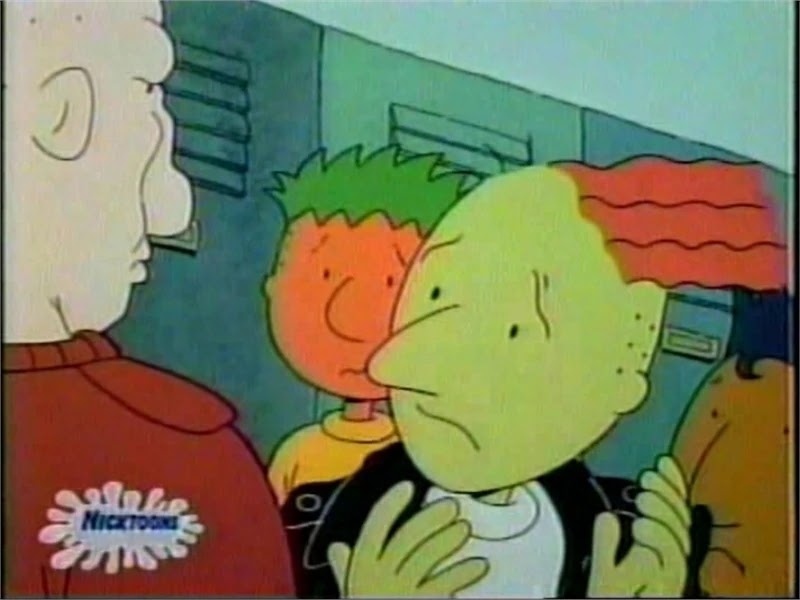 While it is common for bully characters to have that reddish hue for their hair, Roger is a little different. Here, it's to provide a color contrast to his already green skintone. Regardless of what era of DOUG you watch and see Roger's hair as, the orange/lime green combination just looks good on this character.