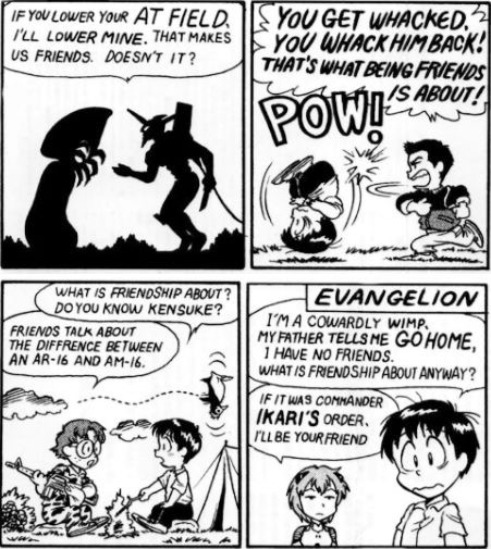 My guess is that whoever drew this fan comic certainly thought the forum post was funny and is also a PEANUTS fan so he/she drew it.Considering that Shinji does punch Toji back in both the TV anime and the Rebuild movies, the friendship is returned in favor.